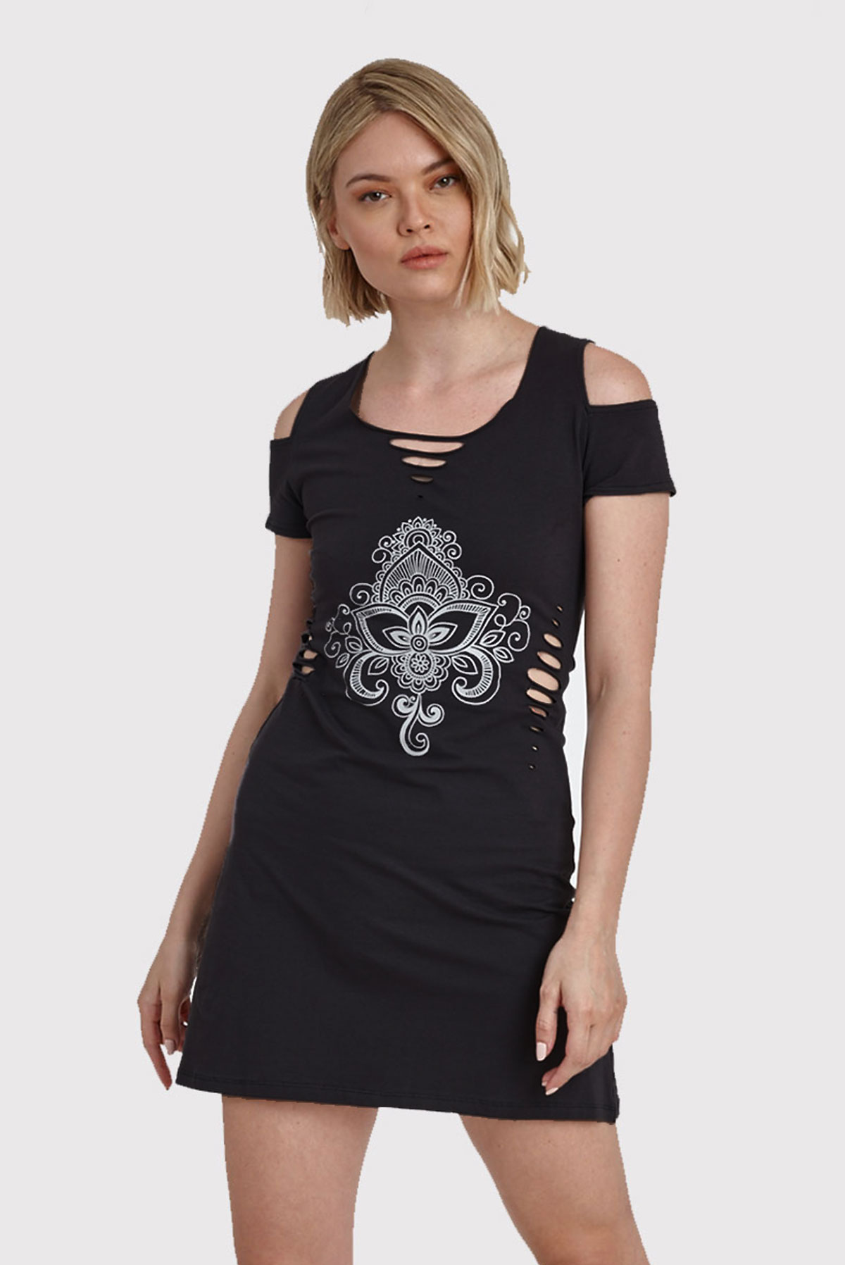 Γυναικείο Φόρεμα με κοψίματα με πλέξιμο και το τύπωμα Henna.