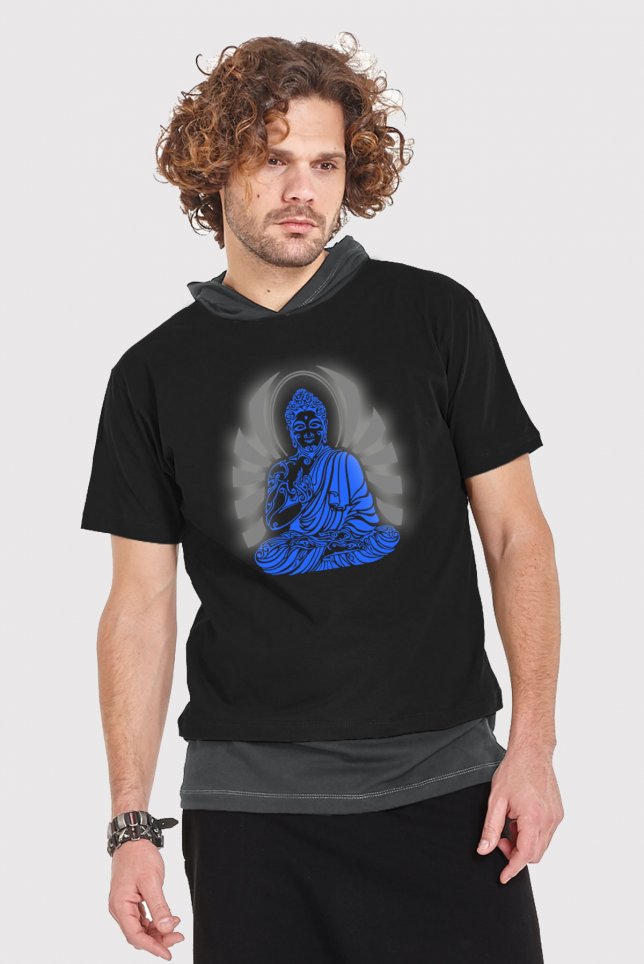 Mens hooded shirt with TIBETAN BUDDHA blacklight active print and mix with reflect print
